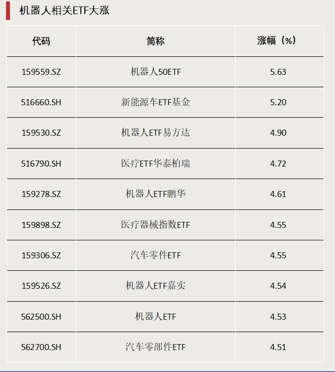 固态电池板块持续上涨,PEEK材料、能源金属、人形机器人概念以及猪肉板块大涨。A股相关ETF中,机器人、新能源车、医疗器械相关ETF涨幅居前。