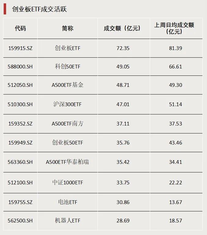 今日涨幅较大的电池ETF、机器人ETF交投显著活跃,较上周日均成交额大幅增长。宽基指数ETF方面,创业板ETF成交额位居A股ETF首位,其次是科创50ETF。此外,3只中证A500ETF成交额超30亿元。