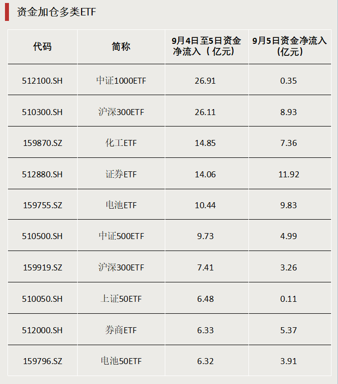9月4日至9月5日,资金净流入中证1000ETF、沪深300ETF,以及化工、证券、电池ETF,多只ETF净流入超10亿元,其中,大部分资金在9月4日当天涌入“抄底”。而此前涨幅较大的创业板、科创板、芯片相关ETF则出现资金净流出情况。